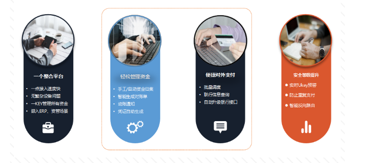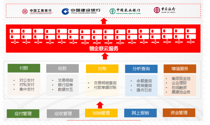 用友银企联以云模式实现企业系统与多家银行系统的直联,一点接入实现企业银行账户的付款、余额查询、回单查询、交易流水、自动归集等功能的云服务。通过系统接口将企业内部的资金管理系统或者资金管理平台同多家银行网银系统相连接,企业无需专门登录银行系统,即可利用自身系统自行实现对外付款、账户信息查询、交易明细查询等功能,满足企业资金集中管理的需要。