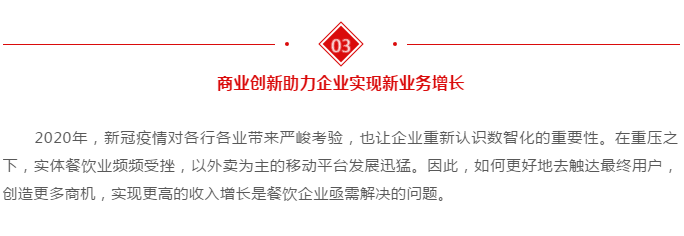 商业创新平台帮助餐饮企业抵抗疫情带来的不利影响,实现业务的持续增长。真功夫是中国最大的中式快餐连锁企业,通过中央厨房实现了“千份快餐一个品质”,在服务自有门店之外,真功夫将供应链中心对外开放,为其他餐饮企业提供从原料生产到配送一体化的专业服务。用友帮助真功夫快速打造数智化的商业平台,实现供应链社会化共享,构建社会化营销能力,打通800家门店和外部客户。在新冠疫情期间,有力支持了真功夫外卖和团餐业务的拓展。