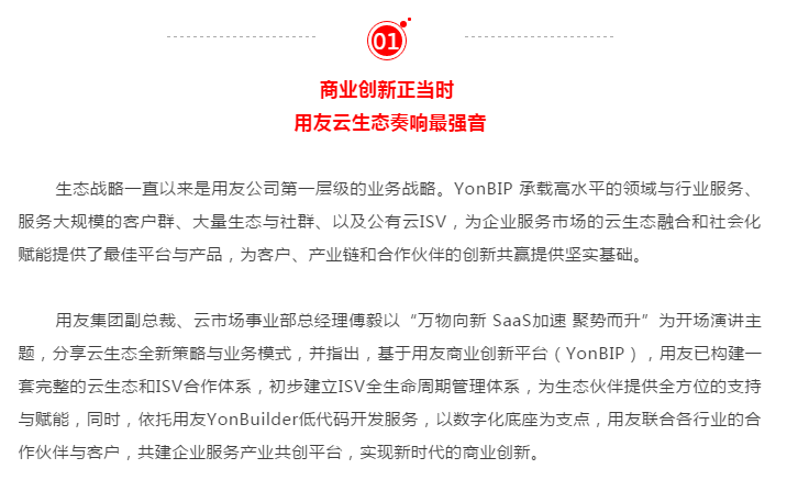 全球的企业形态、组织形态都在向平台化、生态化方向快速演进,作为YonBIP的重要组成部分,用友云生态的业务策略已进行全新升级。作为生态化的企业服务共创平台,YonBIP强生态的共生模式即将孕育出一个全面、强大的综合服务体,高质量的打造创新生态体系。