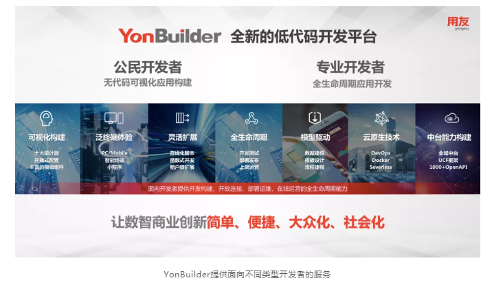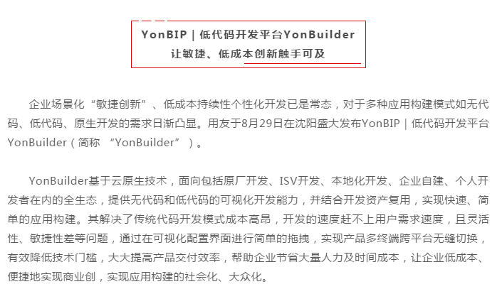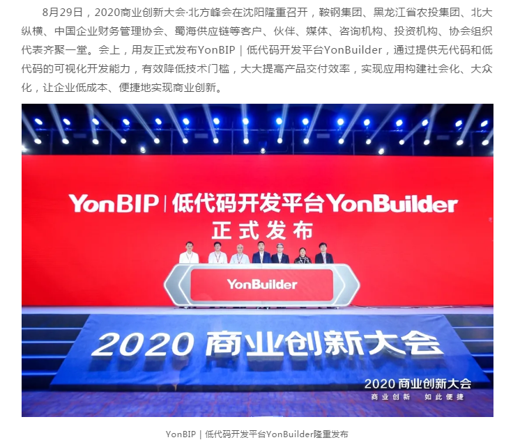 8月29日,由用友主办的2020商业创新大会·北方峰会在沈阳隆重召开,用友在会上正式发布YonBIP|低代码开发平台YonBuilder。平台基于云原生技术,面向包括原厂开发、ISV开发、本地化开发、企业自建、个人开发者在内的全生态,提供无代码和低代码的可视化开发能力,有效降低技术门槛,大大提高产品交付效率,实现应用构建社会化、大众化,让企业低成本、便捷地实现商业创新。