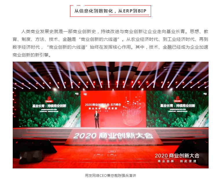 在全新的数字经济时代,数智化正在加速改变商业世界,中国的数智化创新会走在全球前列。用友构建和运营全球领先的商业创新平台,将服务广大企业和公共组织,让商业创新变得简单、便捷、大众化、社会化,为中国和全球的商业创新创造独特价值,为经济和社会发展做出重要贡献。