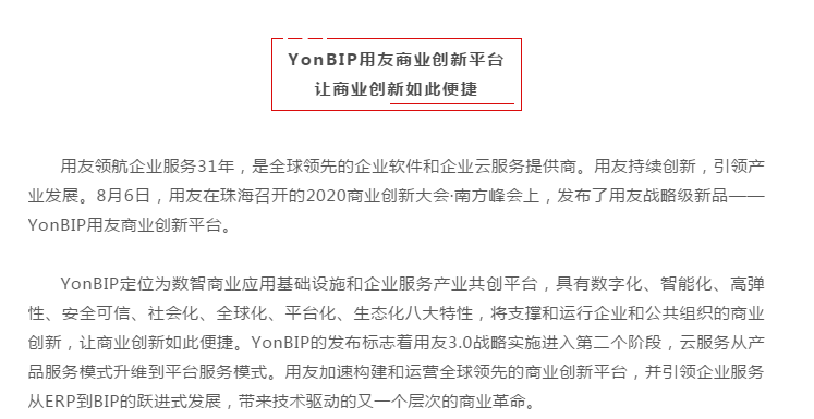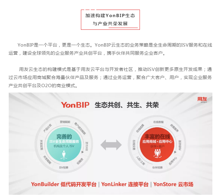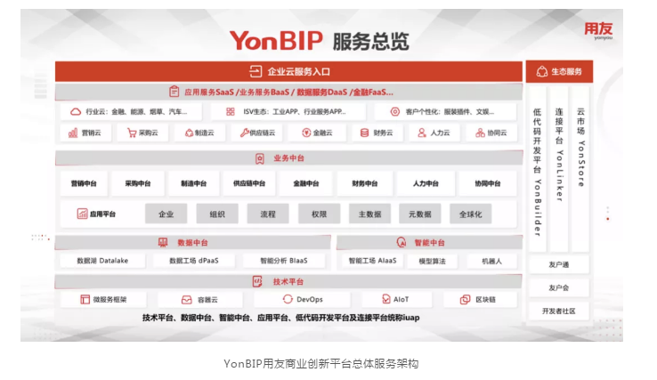 YonBIP基于以移动互联网、大数据、云计算、人工智能、物联网及5G、区块链为代表的新一代数智化技术,按照开放和生态的思想,采用云原生、微服务、中台化、数用分离等全新的架构,构建包括技术平台、数据中台、智能中台、应用平台、低代码开发平台及连接平台的iuap,提供营销、采购、制造、供应链、金融、财务、人力、协同等核心领域云服务和金融、能源、建筑、汽车、烟草、财政等行业云服务,并开展与生态伙伴合作,服务更多的细分领域和行业客户,全面支撑企业、产业链与价值网的数字化、智能化协同,使能企业商业创新。