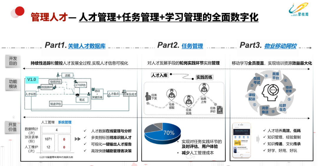 近年来,碧桂园服务积极拥抱数智化技术,已经成功打造出了这样一个“发现人才”“赋能人才”“管理人才”的数字化人才供应链体系。例如,碧桂园在“选才”阶段就把人员的每一个经历变成数据,以人才标签的形式录入系统。这样在产生一个新的岗位空缺后,就能第一时间从人才库里精准匹配,把最合适的绩优人员快速纳入到我们的新岗位培养系统。不难看出,实现这样的流程化智能管理,首先得打造新时代的人才数据库,其次需要搭建实时的任务管理,以及在线的移动网校。如果没有创新技术的支撑,这些根本无法实现。