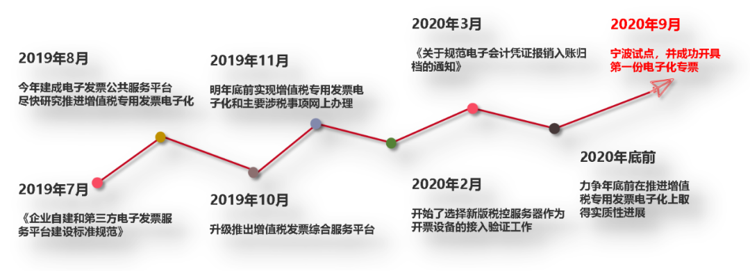 专票电子化是普票电子化的延续和升级,是按部就班推进的。从2019年7月,李克强总理在国务院常务会上提出了专票电子化的要求,接着8月份出台了一系列的政策和行动,从电子发票公共服务平台到政策完善,包括今年3月份发布的《关于规范电子会计凭证报销入账归档的通知》,以及9月份开始的宁波专票电子化试点的通知,并且在宁波开出了第一张电子化的增值税专用发票。