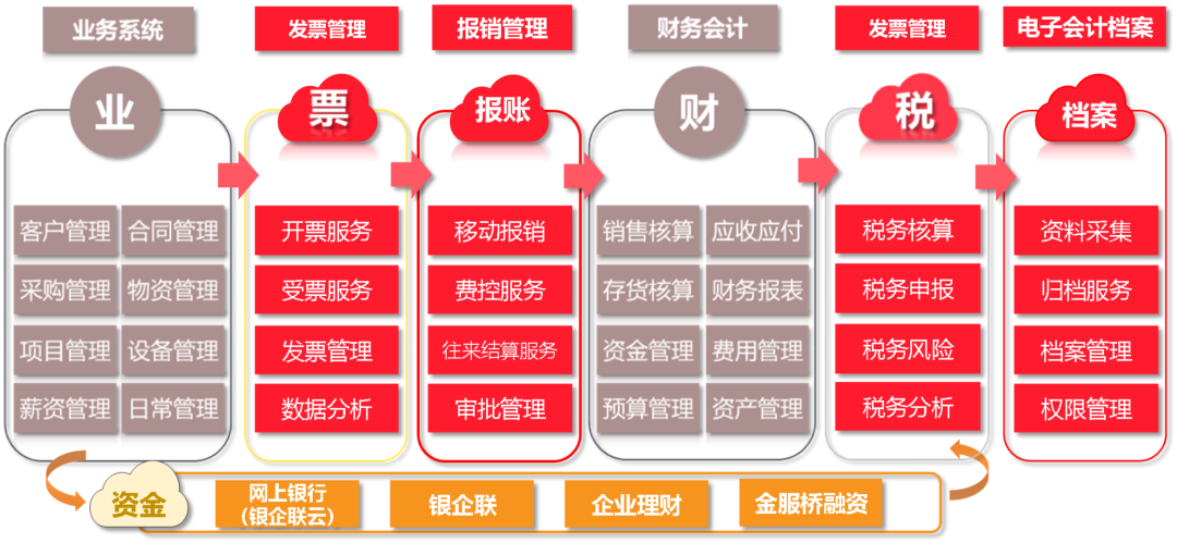 专票电子化之后,企业所有的税务处理动作都会被税局监管到。那么企业该如何做才能匹配的新的环境、新的要求。我们认为,只有企业做到业财税金档一体化才能从根本上解决问题,把业务、财务、税务、资金和档案真正融合起来,而一体化的服务平台是企业财税数智化转型的一个基石。