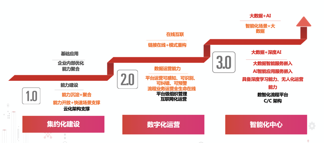 第三步为大数据和深度AI阶段,通过大数据智能服务嵌入、AI智能应用服务嵌入,企业具备深度学习能力、无人化运营能力。
