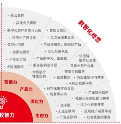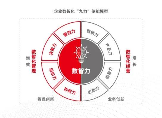其次,《报告》还对企业数智化商业创新的基本过程进行重新定义,指出企业数智化商业创新的基本过程就是数智力赋能经营管理的八大核心要素:即围绕打造营销力、产品力、供应力、生态力所实现的业务创新;和围绕打造管控力、决策力、组织力、协同力实现的管理创新两大部分,从而带来运营效率、经营效益的指数级增长”。