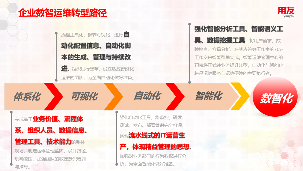 用友基于32年服务经验,结合IT服务发展趋势,构建以业务为导向,业务价值、系统稳定、运维高效、员工满意为管理目标的数智运维模型,全面梳理软硬件,构建标准管理流程,利用内外部资源进行支持,从传统运维向自动化、智能化转变。在帮助企业数智运维转型过程中,用友总结出企业数智运维转型的四个阶段:体系化、可视化、自动化、智能化,在每个发展阶段都可以为企业提供相应的支持。
