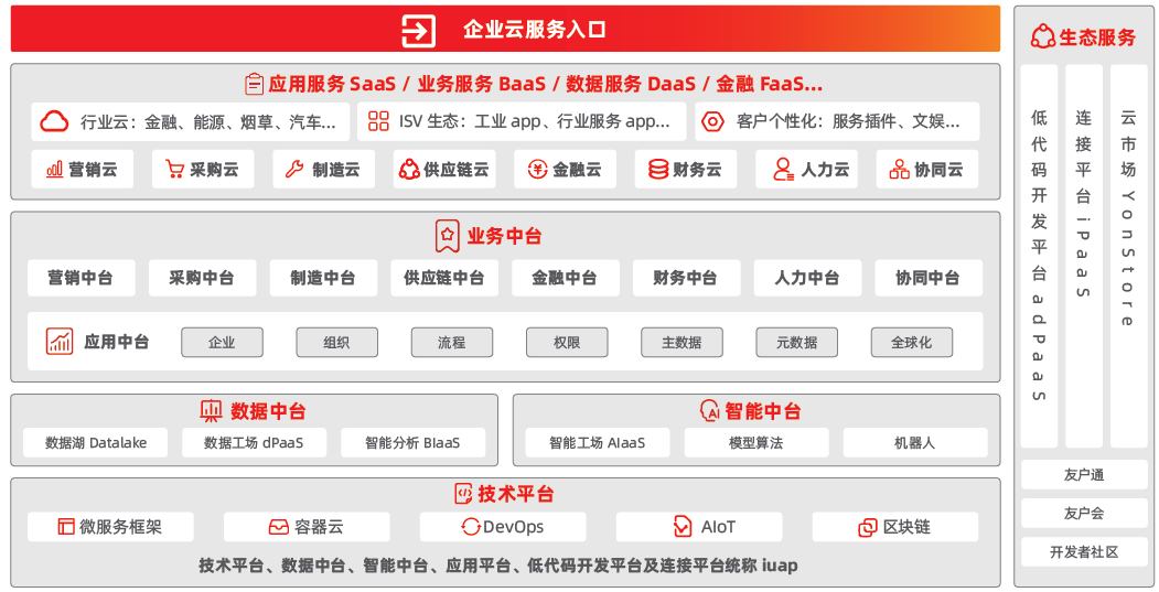 用友于今年8月发布了YonBIP 用友商业创新平台,它是用友在数字经济时代面向成长型、大型企业及巨型企业,融合了先进且高可用技术平台和公共与关键商业应用与服务,支撑和运行客户的商业创新(业务创新、管理变革),并且具有数字化、智能化、高弹性、安全可信、社会化、全球化、平台化、生态化等特性的综合型服务平台。