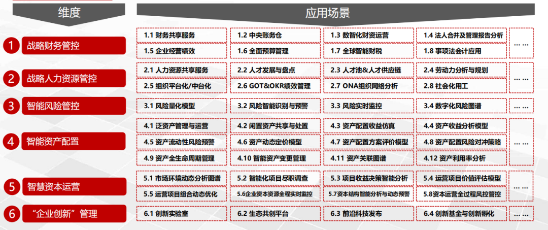 第一,管控力:打造数智化赋能管控,可从这5个维度划分,即:人力资源、风险管控、资产配置、资本运营和企业创新管理,其关键应用场景约40多个。