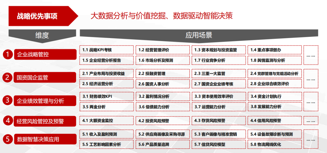 第二,决策力:决策力的打造也可划分为企业战略管控、国资企业监管、企业绩效管理与分析、经营风险管控及预警、和数据智慧决策应用5个维度;约30多个应用场景。