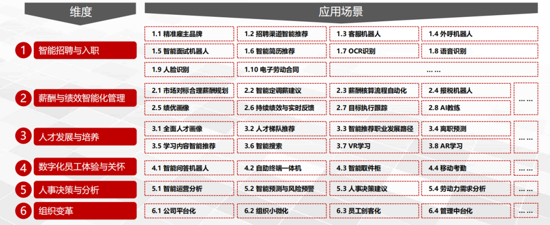 第三,组织力:对组织的打造可划分为智能招聘入职、薪酬与绩效智能化管理、人才发展与培养、数字员工体验与关怀、人事决策与分析、组织变革6个维度;约40多个应用场景。