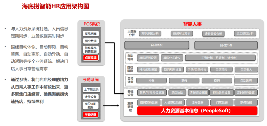 以海底捞的智能化HR为例。海底捞品牌创建于1994年,现已在中国(含香港、台湾地区)118个城市,以及新加坡、韩国、日本、美国、加拿大、英国、越南、马来西亚、澳大利亚等国家经营593家直营门店,拥有4380万会员和88378名员工。数智化HR赋能海底捞组织就是实现了员工智能排岗(自动排岗、自动顶岗、自动要人),极大的提升了海底捞的管理效率,降低管理成本。