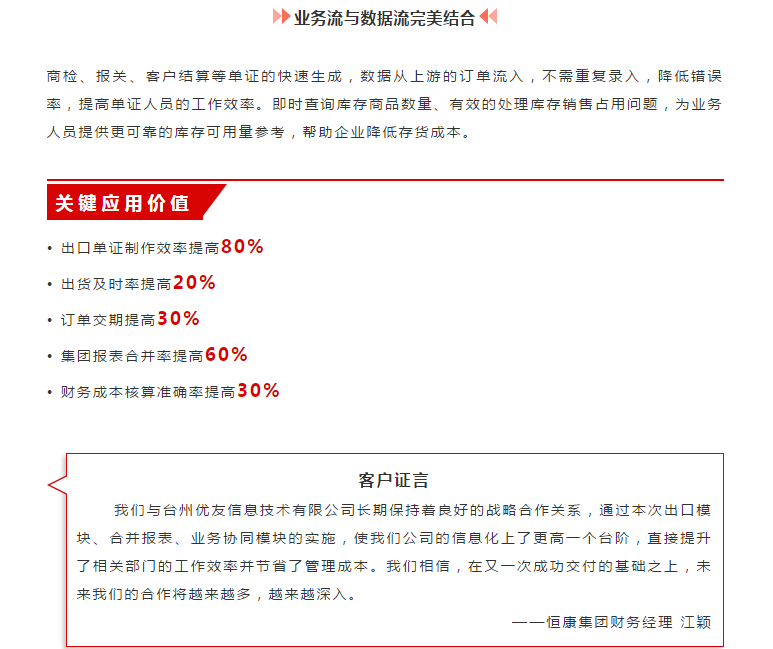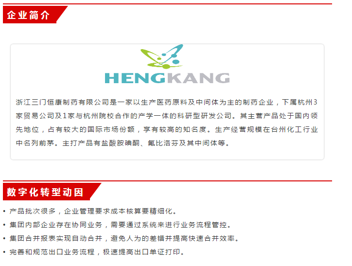 浙江三门恒康是集研产销一体的医化企业,同时下属多家杭州、香港贸易公司,是典型的集团化企业。目前集团销售95%是出口业务,贸易公司和生产企业都有自营出口业务,并且存在内部交易协同。该企业应用用友U8+ 系统,使内部化工物资管控的精细化和质量可追溯性,同时满足了内部业务协同的效率化和可关联性,并且符合IPO审计提出的细化成本批次核算和快速现实集团报表合并,更重要的是完全解决了原有出口单证打印难的问题。