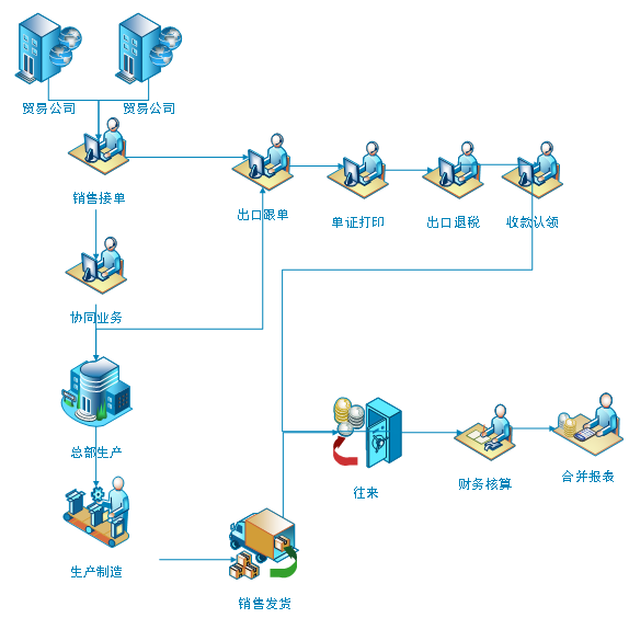 通过贸易公司和生产总部账套间的协同路线设置,自动生成多账套的协同单据,减少了重复录入的工作量,并减少了人为操作的错误。