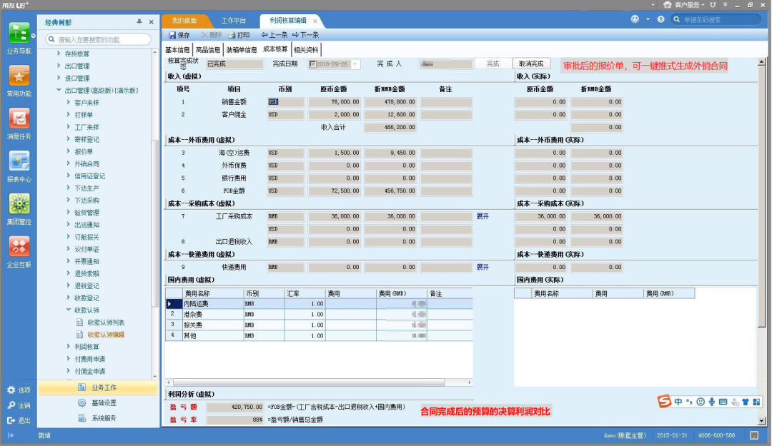 • 财务进行收款、付款、费用、退税等核算,计算最终利润。
