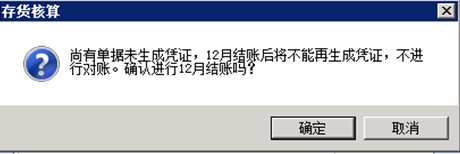 注意:该提示不严格控制,点击不制单也可结账,但存货12月未生成凭证的记录不能结转到下年度制单,所以12月不生成凭证,单据记录会结转到次年作为存货期初,但总账中无对应科目数据,会造成存货和总账次年期初对账不平。