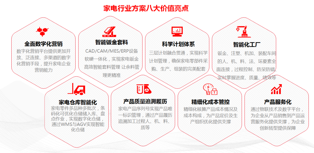 中山中友实施总监肖文华先生从当下疫情家电企业面临的困难出发,强调在疫情和全球化贸易矛盾新常态下,小家电企业数字化转型的迫切性,随后,肖总根据多年来的实践经验,分享了用友家电行业数字化解决方案。首先肖总介绍数智化整体框架,随后分别从家电企业的产品设计、计划管理、 营销管理、智能工厂、仓储数字化、精细化成本、车间绩效等角度进行详细讲解,根据肖总分享的家电行业数智化方案针对家电企业有如下8大关键价值: