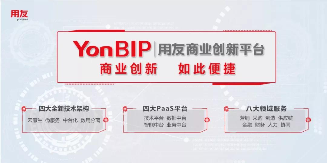 自1988年成立以来,用友持续32年专注以信息技术服务企业创新发展,在此基础上,用友着力研发打造了全新一代产品:用友商业创新平台(YonBIP),这一平台的核心理念,就是要让商业创新如此便捷。YonBIP基于全新的技术架构,有四大平台底座——技术平台、数据中台、智能中台和业务中台,面向企业服务八大领域——营销、采购、制造、供应链、金融、财务、人力、协同。