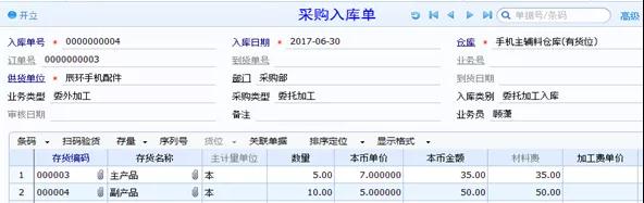 · 参考实例:主产品:副产品:材料=1:1:1,委外订单0000000003数量10个,材料单价12元全部出库,主产品分两次入库,副产品一次全部入库。
