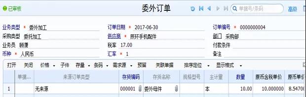 产品:材料=1:1,委外订单10个,材料单价5,已全部出入库,产品也入库核销完成,后续补发2个材料,做委外核销调整,查看结果。