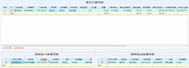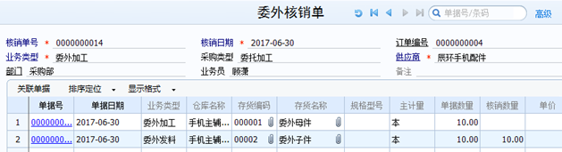 · 来源委外订单号相同的入库单与材料出库单才能参与委外核销;