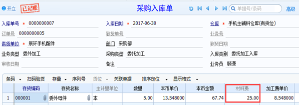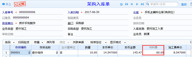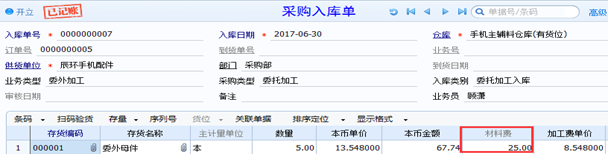 核销调整后,对材料出库单记账,入库单记账,查看入库单材料费:已经包含核销调整的材料费用。