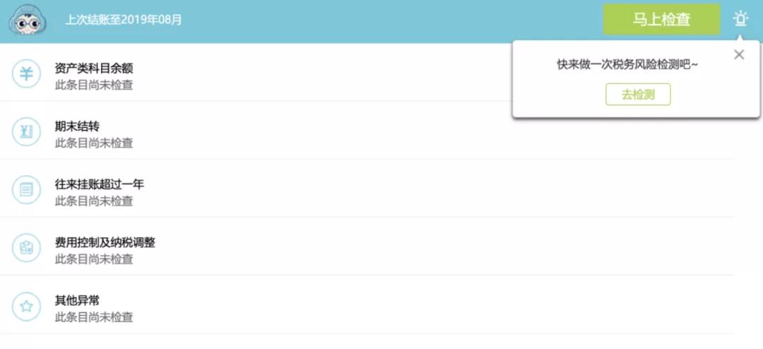 此外,畅捷通好会计还能月末结账一键检测财务结账风险,与新政策无缝接轨。简单快捷的操作,极大减少财务结账核对的时间,依据系统内的数据报表,自动检查账目异常,如:资产类科目余额有无赤字、报表是否平衡、凭证断号、往来欠款、费用情况等。