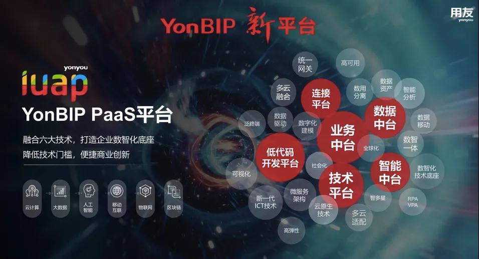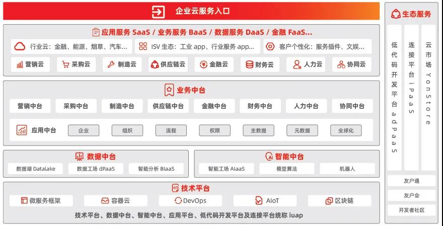 而最新的iuap5.0,更是完全基于云原生架构重写的新一代PaaS,包括了技术平台、数据中台、智能中台及业务中台,为企业提供了中台化构建能力、多云环境下的混合云开放集成互联互通能力、 技术普惠化下的低代码开发和数智能力、自助应用快速构建能力,支撑企业服务产业生态伙伴共享共创, 实现数字企业的智能服务。