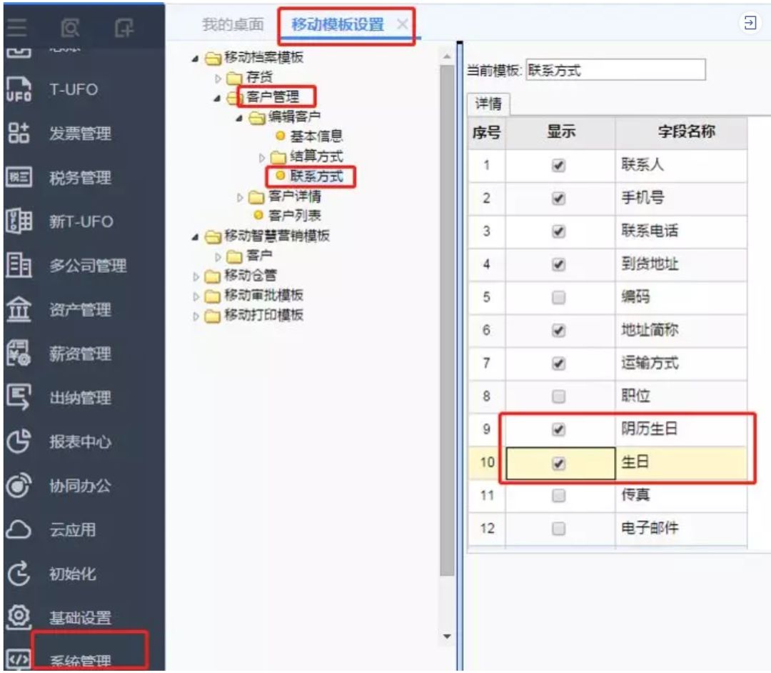 T+Cloud智慧营销加入了【客户关怀提醒】。提醒近3天过生日的客户,同时支持公历和农历生日。启用方法很简单,在T+Cloud【系统管理】中--选择【移动模板设置】--【客户管理】-【联系方式】,在弹出的详情中,勾选【生日】和【阴历生日】。