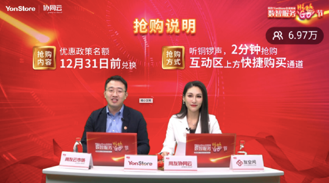 没错,我说的就是“用友YonStore在线商城数智服务嗨购节”(简称“High GO节”)。在刚刚过去的“双12”,用友云市场应用商城焕然一新,正式更名“YonStore”,并联合协同云,携手重要生态伙伴,打造了业内首场直播活动,并开展4大专场、8款产品的重磅推荐与超值促销,在为用户带来“巨惠”狂欢的同时,传递了用友云生态战略布局与价值。其中,友空间作为此次活动的“主角”之一,展现了其强大的流量入口价值。