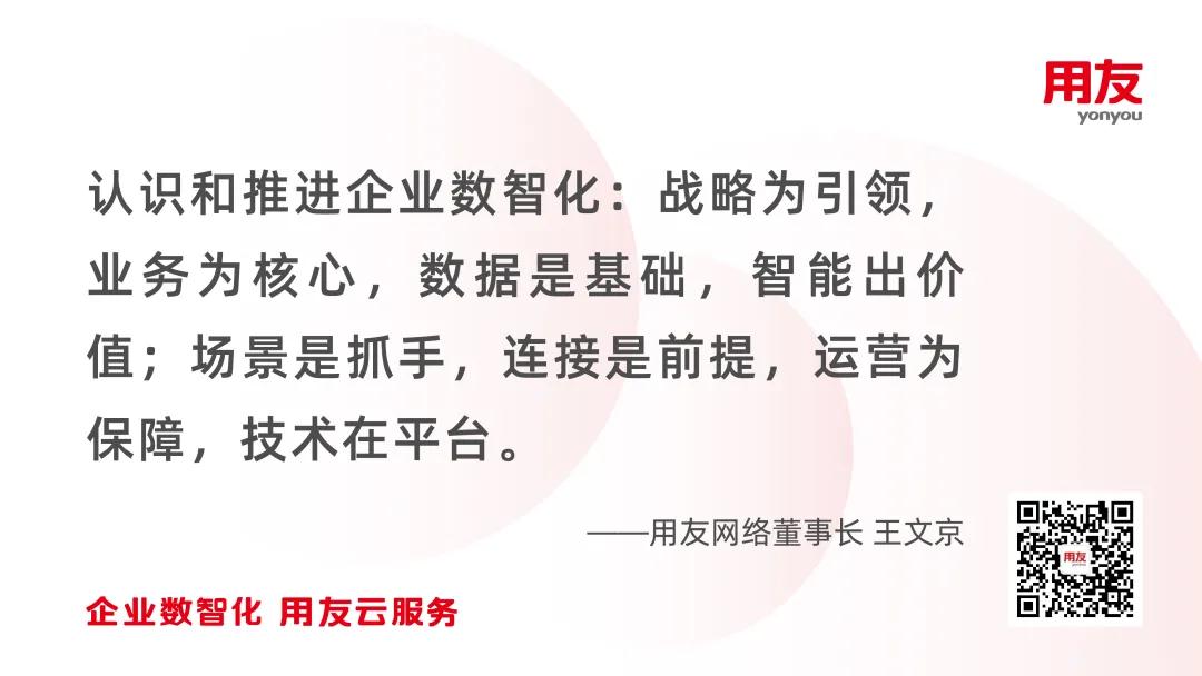 在服务众多企业的实践基础之上,王文京总结了企业认识和推进数智化的八个关键:“企业的数智化,要以战略为引领,以业务为核心,数据是基础,智能出价值。企业在推进数智化过程中,场景是抓手,要从企业的痛点场景出发;连接是前提,因为这一轮新技术驱动的商业创新是建立在网络化的基础上,所以必须连接;运营为保障,(数智化)不是事后的批处理系统,是需要持续运营的;技术在平台,企业不需要掌握繁杂的技术,选择合适的平台,应用平台提供的技术能力就可以。”